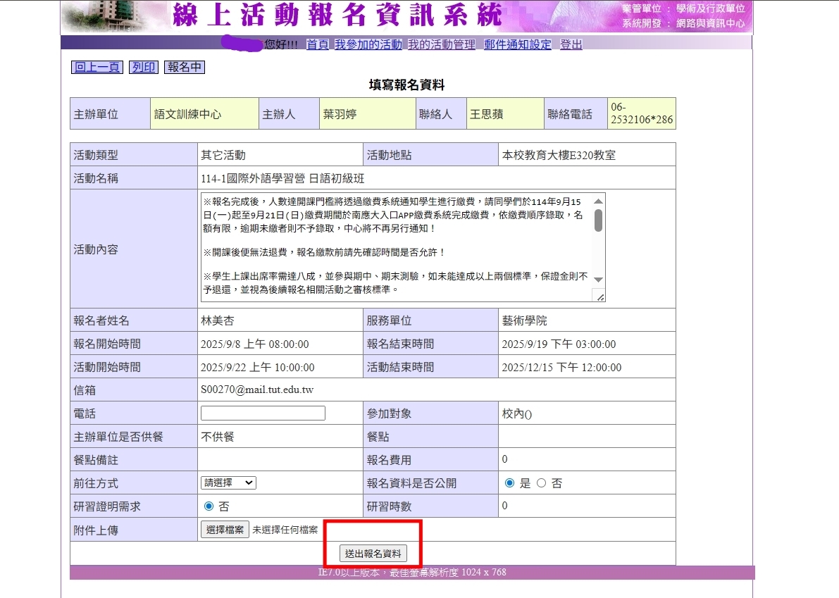 5.進入報名頁面後>點擊最下方"送出報名資料"即可完成報名